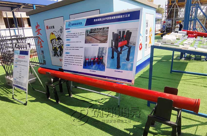 在觀摩會現(xiàn)場,還有一個紅色圓柱外形的東西吸引了眾多觀摩人員的注意。湖南教建集團(tuán)有限公司國欣向榮廣場項(xiàng)目項(xiàng)目總指揮長李海平介紹,這是其公司自創(chuàng)的泵送混凝土水平泵管減振消磨施工工法。該工法運(yùn)用的關(guān)鍵在于利用鋼筋、鋼板、滾筒、軸承等制作一種減振支架作為混凝土輸送水平泵管的支座,以減少在混凝土泵送過程中泵管振動對已綁扎好的鋼筋骨架、模板的影響。